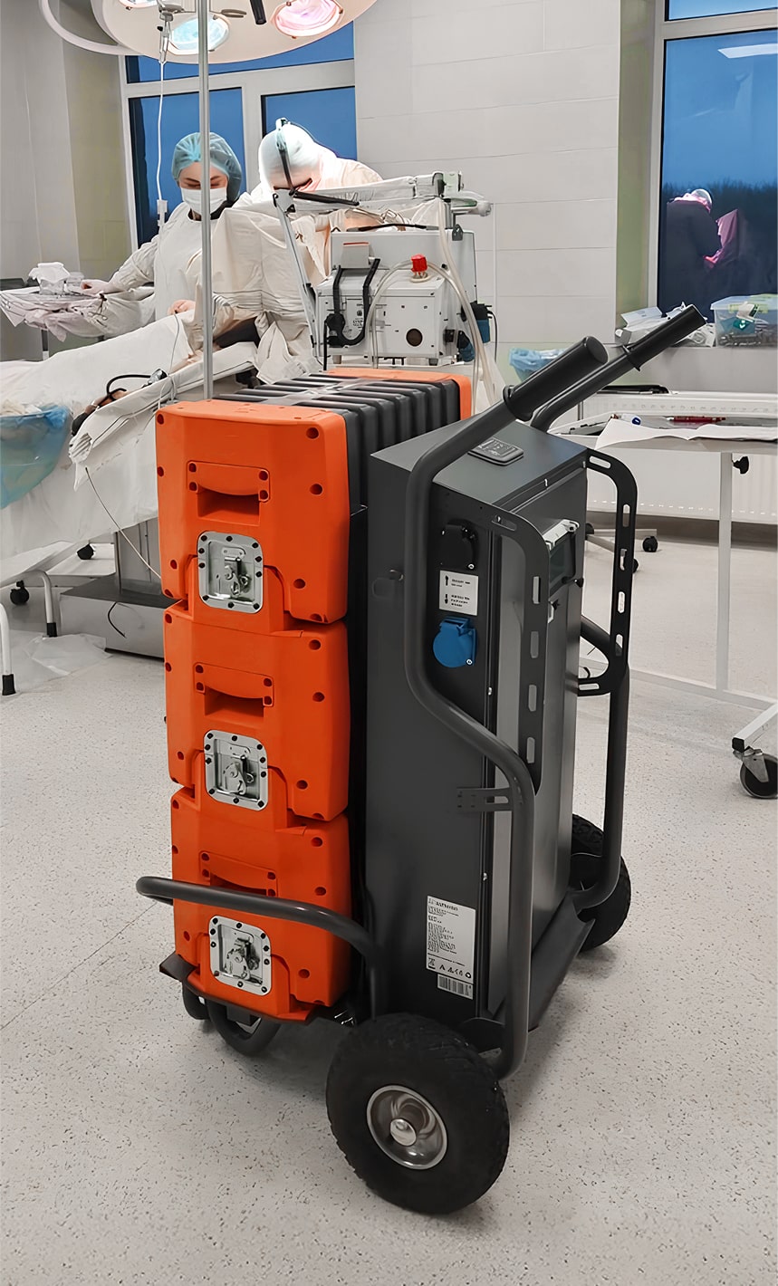We have already delivered nearly 100 mobile charging stations to communities, and they are actively being used at critical infrastructure sites — primarily in hospitals, as well as in schools, kindergartens, and by Ukrzaliznytsia repair crews. This is modern German-made equipment with a capacity of 7 kWh, designed to provide fast backup power during electricity outages. The stations are easy to transport and quick to deploy, which is especially important for medical facilities, emergency services, field hospitals, and mobile repair teams. In hospitals, these systems have proven particularly effective: they provide stable, clean power without voltage fluctuations — which is crucial for sensitive medical equipment. Unlike diesel generators, they operate silently, without smoke or harmful emissions, making them safe for indoor use. We do not donate these stations but provide them free of charge for temporary use, ensuring flexible and efficient deployment where they are needed most.