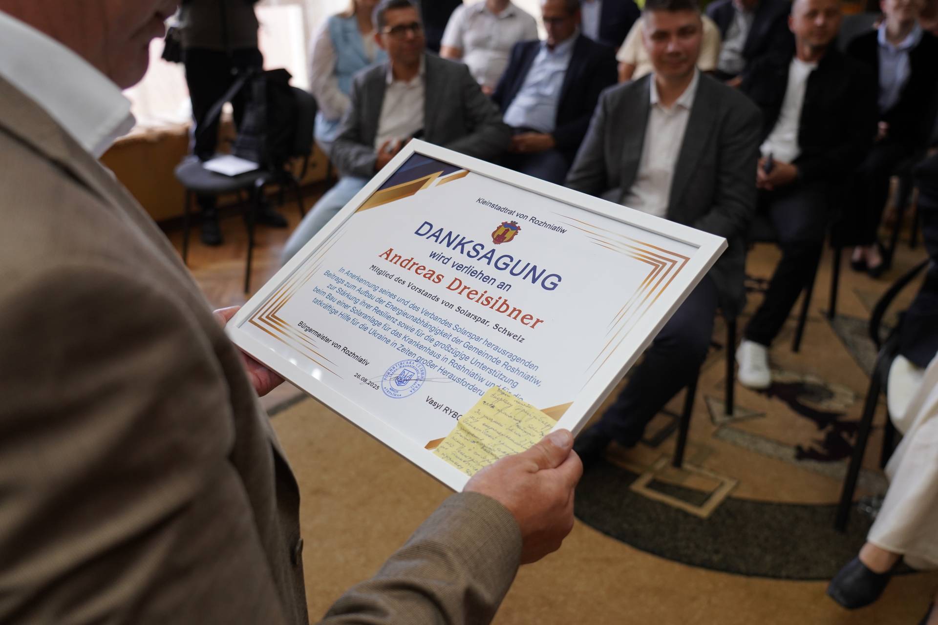 This project was made possible thanks to the support of our financial partner Solarspar, and in particular Andreas Dreisiebner, whose strong commitment played a key role throughout. We deeply appreciate his dedication and his decision to personally travel to Ukraine for the official opening of the solar power plant in Rozhniativ.